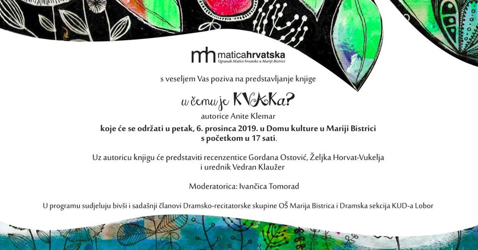 U organizaciji Ogranka Matice hrvatske u Mariji Bistrici će u petak, 6. prosinca 2019. godine, biti održano predstavljanje 1. zbirke dramskih tekstova za djecu i