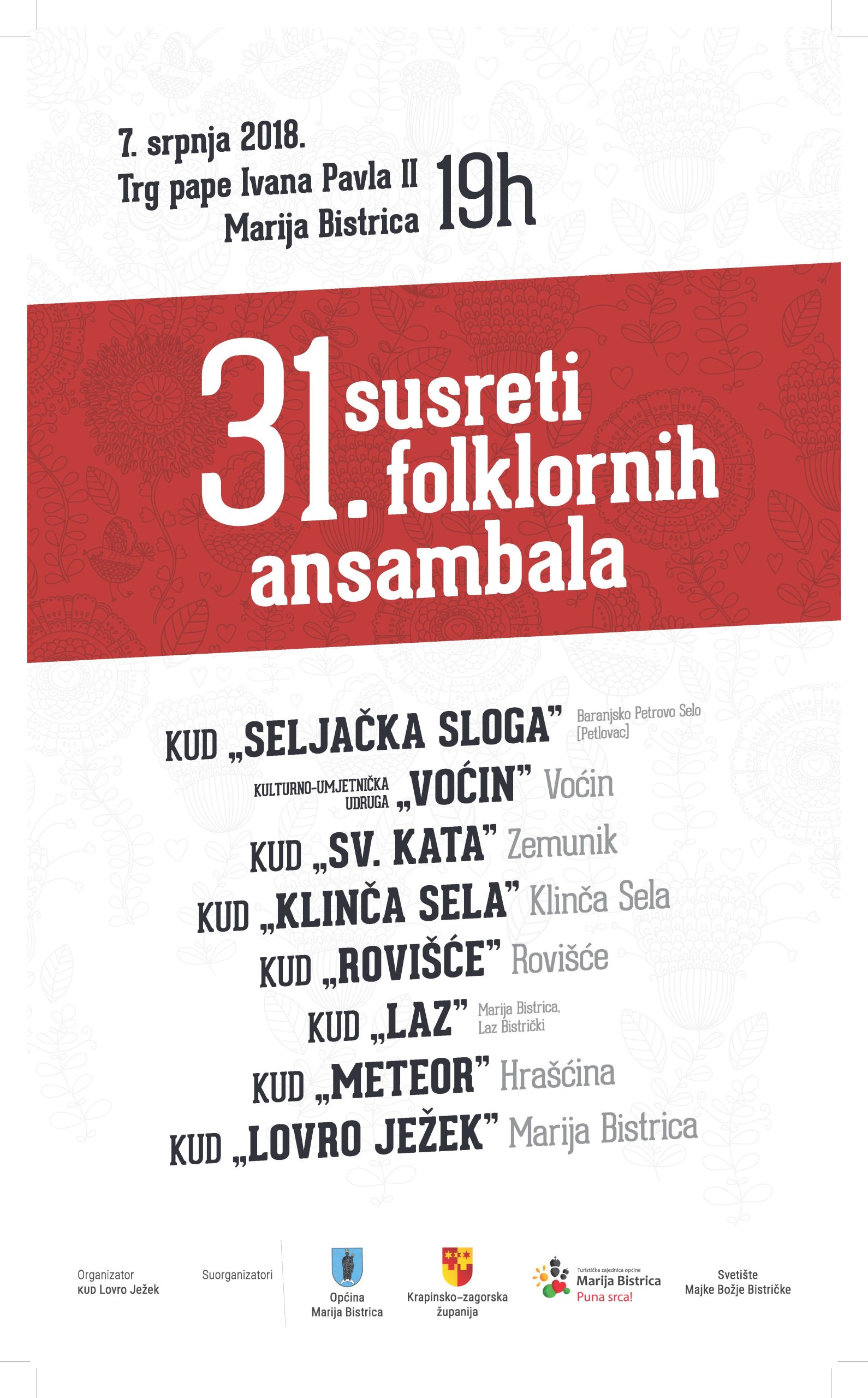 Ljeto u Mariji Bistrici nastavlja se ove subote, kada KUD Lovro Ježek Marija Bistrica organizira 31. susrete folklora, koji na središnjem bistričkom trgu počinju u