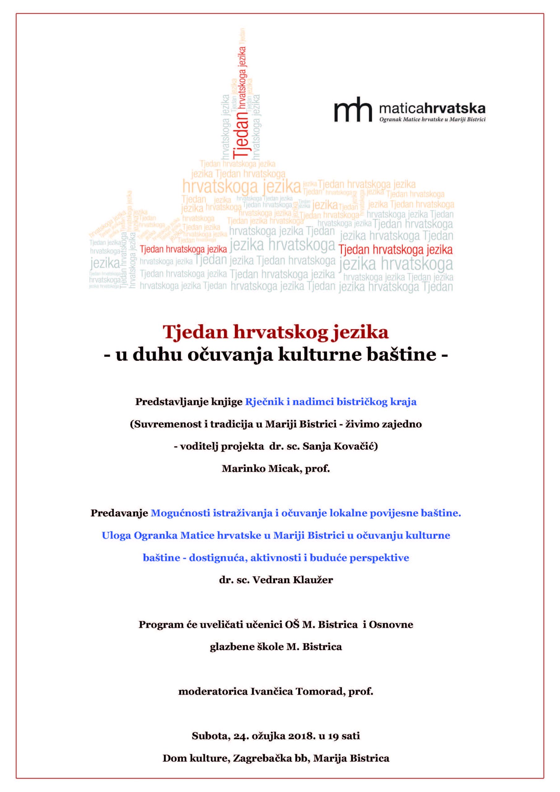 Ogranak Matice hrvatske u Mariji Bistrici i ove je godine obilježio Tjedan hrvatskog jezika i to u subotu u Domu kulture u Mariji Bistrici. Između