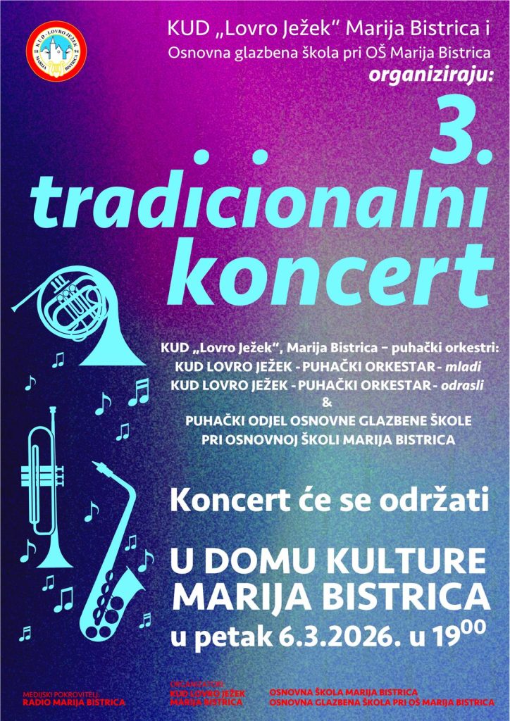 U Domu kulture u Mariji Bistrici ovoga petka na rasporedu je zanimljiv koncert, nastao kao plod suradnje između KUD-a ”Lovro Ježek” Marija Bistrica i Osnovne glazbene škole pri OŠ Marija Bistrica koja je započela pretprošle godine, pa će ovo biti već treći ovakav koncert. Na koncertu će nastupiti Puhački orkestar KUD-a ”Lovro Ježek” – mladi i stariji i Puhački odjel Osnovne glazbene škole pri OŠ Marija Bistrica. Početak koncerta je u 19 sati, a ulaz je slobodan.