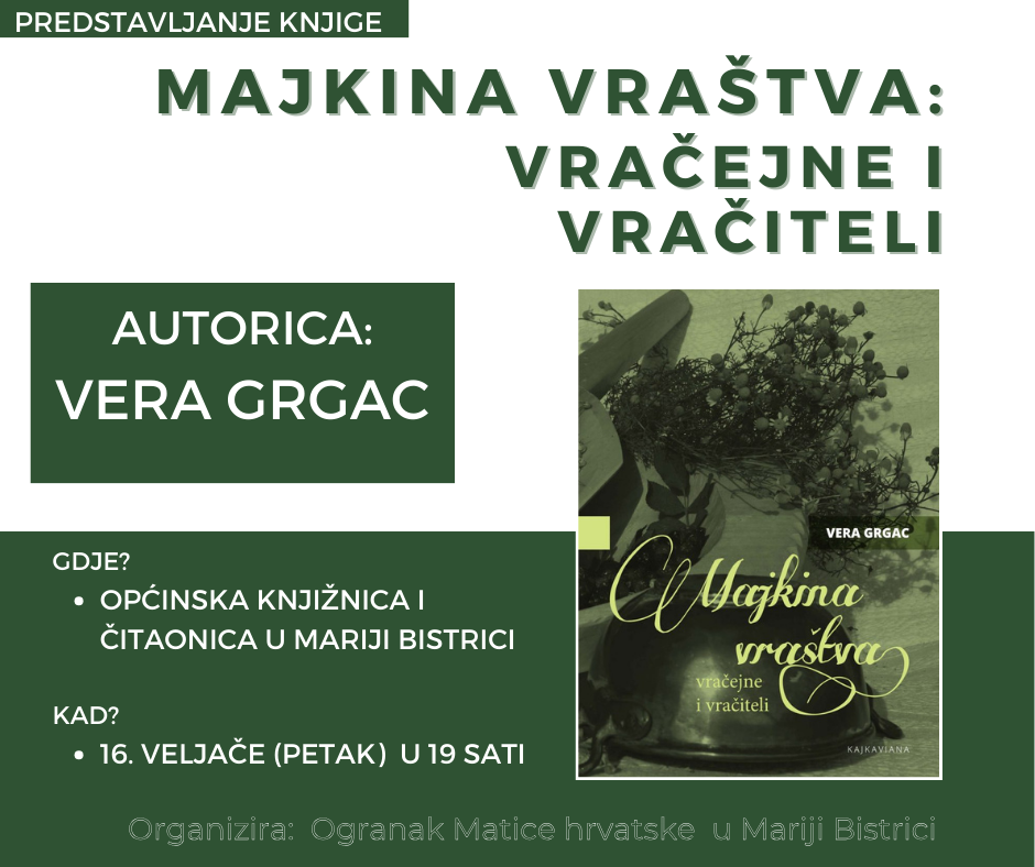 Ogranak Matice hrvatske u Mariji Bistrici organizira predstavljanje knjige Vere Grgac ”Majkina vraštva: vračejne i vračiteli”, koje će biti održano u petak, 16. veljače 2024.
