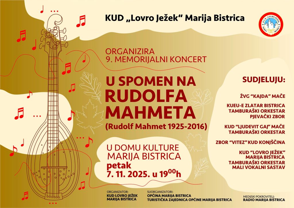 KUD ”Lovro Ježek” Marija Bistrica organizira još jedan koncert ”U spomen na Rudolfa Mahmeta”, u spomen na velikog zagorskog umjetnika, koji je ostavio ogroman trag u bistričkom KUD-u, ali i u brojnim drugim zagorskim društvima. Ovo će biti deveti koncert posvećen Rudeku, a održat će se u petak 7. studenoga u 19 sati. Nastupit će Tamburaški orkestar i Mali vokalni sastav KUD-a ”Lovro Ježek” Marija Bistrica,  ŽVG ”Kajda” Mače, Tamburaški orkestar i pjevački zbor KUEU ”Kaj” Zlatar Bistrica, Tamburaški orkestar KUD-a ”Ljudevit Gaj” Mače i Zbor ”Vitez” KUD-a ”Konjščina”. Rudolf Mahmet – Rudek rođen je 1. srpnja 1925. g. u Mariji Bistrici. Od osnutka KUD-a ”Lovro Ježek” iz Marije Bistrice 1974. g., voditelj je Tamburaške sekcije i aktivni svirač do 2011.g. U toj dugačkoj folklornoj karijeri iza njega su ostali brojni nastupi u zemlji i inozemstvu te glazbeni aranžmani mnogih pjesama. Također je dugi niz godina vodio ŽVG Kajda iz Mača. Rudek je glazbeno surađivao i s brojnim drugim kulturnim društvima, skupinama i umjetnicima: KUD-om ”Ljudevit Gaj” iz Mača, KUD-om ”Sloga” iz Velikog Trgovišća te s kulturno-umjetničkim društvima iz Lobora, Donje Zeline i Donje Bistre, Tamburaškim sastavom ”Zlatne žice”, klapom ”Bistrica” iz Marije Bistrice, ali i poznatim glazbenim solistima Radekom Brodarcem i Ivicom Pepelkom. Gotovo cijeli folklorni glazbeni fundus KUD-a ”Lovro Ježek” pisao je Rudek, a pisao je i za ostala društva s kojima je surađivao. Rudek ima preko 700 naslova u svojoj arhivi od kojih je više od 360 napisao sam u smislu komponiranja i aranžmana. Preminuo je 2016. godine. Ovim svečanim koncertom, po deveticputa nastavlja se održavanje sjećanja na ovog velikog glazbenika.